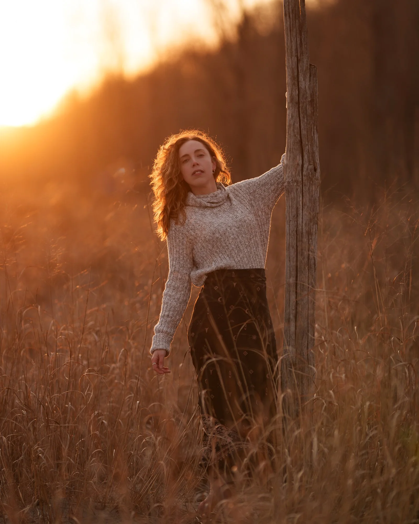 One of the best parts of photographing outdoors in the fall is how every backdrop feels like a painting. We played with a few different looks—close-ups with colorful leaves framing her face, wide shots with Chelsey standing against a backdrop of tall trees, and even some moody, low-light shots as the sun started to dip.